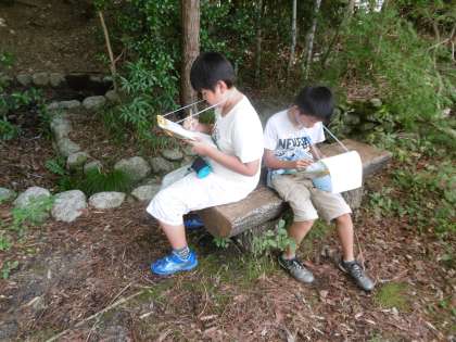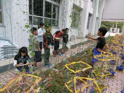 1時間目は,子ども達が春から育てているツルレイシの観察,2時間目は,いのちの森や運動場にある植物や動物の観察でした。