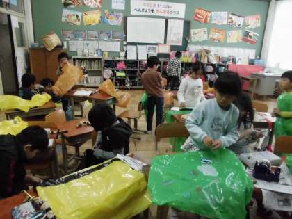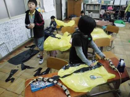 11月9日(水)今日は衣装作りです。どうしたら自分の役の動物になるか,ビニール袋と格闘です。カラーゴミ袋は切りにくくて,かつすぐに破れます。