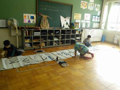 書写の時間,毛筆に慣れるように,筆使いの練習をしています。今日は,大きな紙に書くように,みんなで準備して書きました。手の動きや,手首の使い方などに気をつけて,思い思いの言葉を書きました。1枚書き終えてから,「もっと書きたい!!」と言って,自ら準備して,書いていました。気持ちのこもった作品ができました。