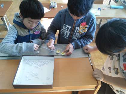 ビーズを10個ずつ数えました。10個を1本の棒にしました。次に,「10の棒はいったい何本あるのでしょう?」という問題を考えました。「みんな数えよう!」「また10本ずつにしてみよ!」など,話し合いながら,数えました。なんと100本ありました。 と,いうことは…「10の棒が10本でビーズは100個。」「10の棒が100本あるやん。」「100個が10あるし。」など,いろいろな意見が出てきて,「わかった!ビーズは,1000個や!!!!!!!」と答えが出てきました。