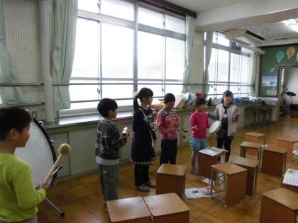 音楽室で普段あまり使わない楽器(ウッドブロック・クラベス・たいこなど)も取り入れて,楽器の足し算をして楽しみました。段々と深みのある音になっていくのを楽しんでいました。
