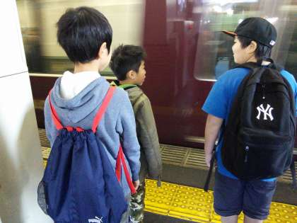『小さな巨匠展』の鑑賞に行きました。事前に調べたバスに乗ると,なんと大原野中学校のお兄さんやお姉さんたちの姿がありました。バスに乗るだけでも心もうきうきしているところ,一緒に遊んだことのあるお兄さんたちとの遭遇に笑顔もいっぱい!次に,阪急電車に乗りました。券売機で事前に練習した通り,「こども」ボタンを押して上手に切符を買うことができました。