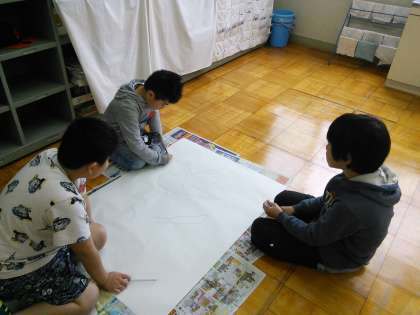 3くみでは自分のがんばりをふり返り,それをはっぱに書いて木に貼りつける『すてきの木』に取り組んでいます。今年度は自分たちでどんな木にするのか話し合って,みんなで書くところから始めました。「下の方が枝が長いねん。」「先が細いなぁ。」いろいろ話す中で自分の思い描く木と違ったり,同じ木をイメージしているのに上手く伝えることができなくて困ったり…たくさん話し合って木を仕上げることができました。
