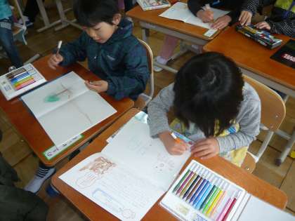 机に座って,丁寧にぬりえやお絵かきをしています。