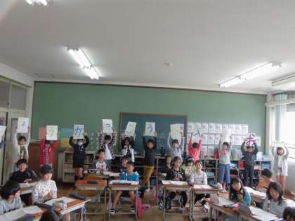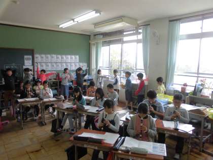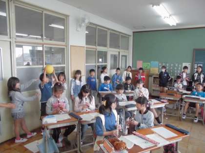 今年,5年生ではピタゴラスイッチのオープニングテーマ曲をリコーダーで演奏し、そのリズムに合わせて”絆”ボールを落とさずにつなげていきます。