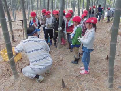 子どもたちは,小さいスコップでコツコツとたけのこの周りを掘っていき,最後に専用の道具を使って掘り起こしていました。
