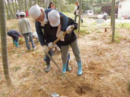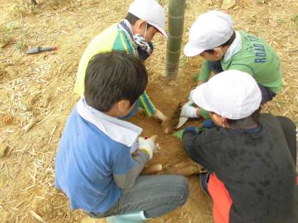 今年は,自分のスコップだけでなく,たけのこほりの先生方にたけのこほりの道具を使い,教わりながらたくさんのたけのこを掘り起こしていました。出発前に,竹に関する疑問を教室で出し合っていたので,たけのこを掘りながらも,みんなの疑問をたけのこの先生方にぶつけている子がいました。さすがは4年生。昨年とは違って,少しレベルアップしたたけのこ掘りになりましたよ。