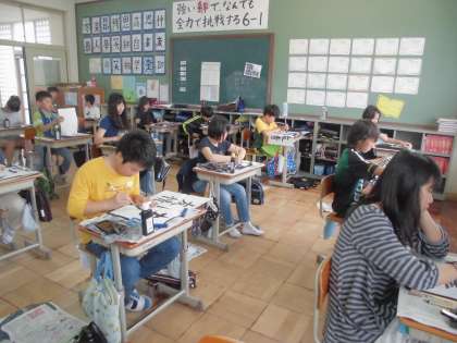 書写の時間に毛筆に取り組みました。左右のバランスに気をつけながら『友情』という文字を書きました。集中しながらじっくり丁寧に書きました。