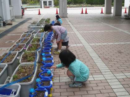 8日にまいたあさがおの植木鉢に,毎朝登校後水やりをするお仕事が1年生に増えました。自分の植木鉢にやさしく水をあげている姿は,愛情たっぷりでとてもかわいいです。