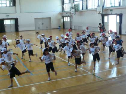 1年生の団体競技「パイナップルは落とさないぞ!」の競技の前にかわいくダンスを踊ります。