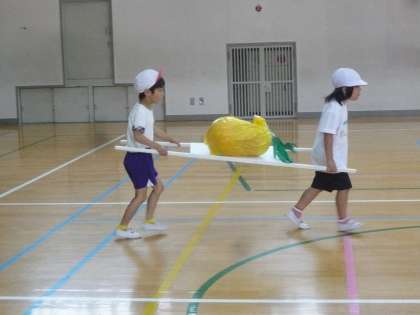 今年の1年生は台の上にパイナップル(?)を乗せて,競争します。