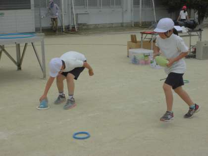 前回の練習では,フラフープ跳びができない子が多かったのです。そこで,各クラスの教室にフラフープを置き,いつでも練習できるようにしておくと,さすがは4年生,休み時間に自主練習をしている子が多く,今日の練習ではみんなずいぶん上手に跳べるようになりました。競技の勝敗のカギはフラフープにあり・・です。