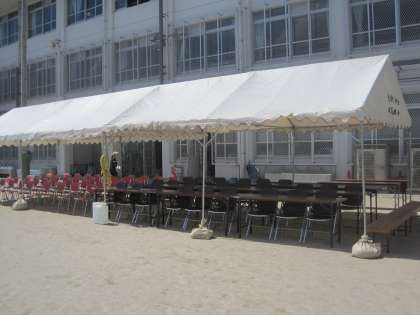 5・6年生全員で,まずテントで使う机やいすを体育館や