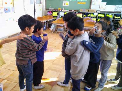 今まで学習したあいさつ、色や数、体の部分のほかにじゃんけんの仕方を学習しました。先生と勝ち抜きのじゃんけんをしたり、ともだちとじゃんけん列車をしたりする中で、だんだんと言い方を覚えていっていました。