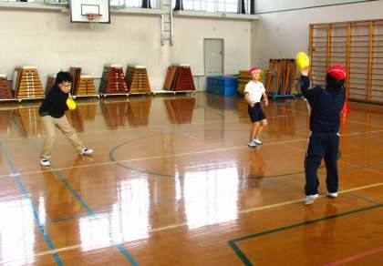3組の体育の時間には、タグ取りゲームやタグラグビーボールを使ってのパス、簡単なゲーム等を行っています。ボールを相手の受けやすいところに投げたり、しっかり受け取ったりできるようになってきています。ゲームでは先生たちも入って楽しく行いました。