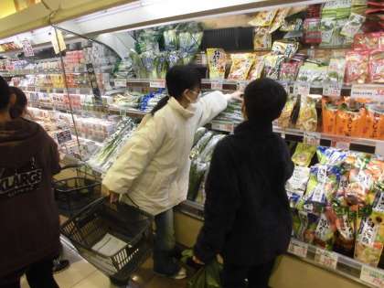 買い物計画を立ててから買い物に行ったため、迷わず効率的に買い物を行うことができていて感心しました。必要な分だけ買うために、袋詰めされているものではなく、1つ売りのものを選んだり、2パックで売っているものを他の班とシェアしたりして、よく考えて買い物をしていました。材料はそろったので、明日、明後日と調理実習でおいしいおかずを作れるようにがんばります!