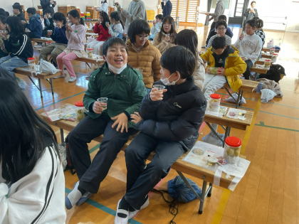 梅のシロップを使った梅ジュースで乾杯しました。やさしい甘さと酸味が疲れをとってくれ、大変おいしかったです。どの子も大事そうに飲んでいました。梅ゼリーや梅干しもお土産でもらいました。日本の梅のシェアの半分は和歌山産とのこと。ゲストティーチャーの先生も小さな頃から梅畑を見ながら育ったとのことで、梅畑がたくさんある和歌山県にも行きたくなりました。