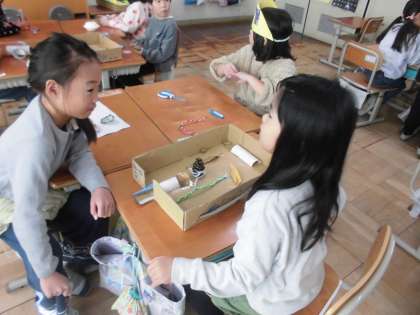 生活の時間に秋のものを使ったおもちゃを作り、自慢のおもちゃを紹介しました。工夫したポイントや頑張ったところを紹介し合い、「いいね!」「すてきだね!」と伝えあうことができました。