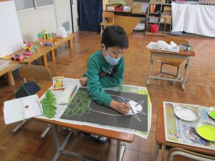 3組で育てたダイコンの絵を始めました。5、6年生は、黒い画用紙に描いていきます。ダイコンの形や色をよく見て、実や葉の形を丁寧に描きました。完成が楽しみです。