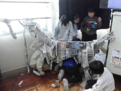 図工「つないで つるして」の学習では、新聞紙やチラシを使って、つないだりつるしたりして楽しみました。