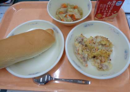 今日の給食は、「ミルクコッペパン・ペンネの豆乳グラタン・野菜のスープ煮・牛乳」でした。ほかほかのグラタンと野菜たっぷりのスープ煮で、心も体も温まりました。ごちそうさまでした。