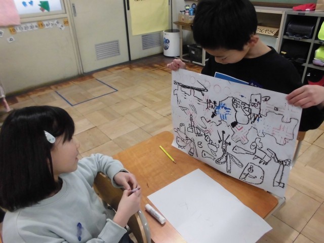 図工の時間に、自分の作品の紹介を行いました。作品の名前、工夫したところ、見てほしいポイントを伝えあいました。「ここすごいね!」「この形はなに?」と質問し合う姿もありました。