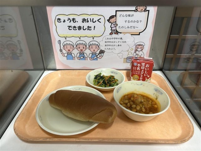 今日の給食は、「黒糖コッペパン・牛乳・ポークビーンズ・小松菜のソテー」でした。