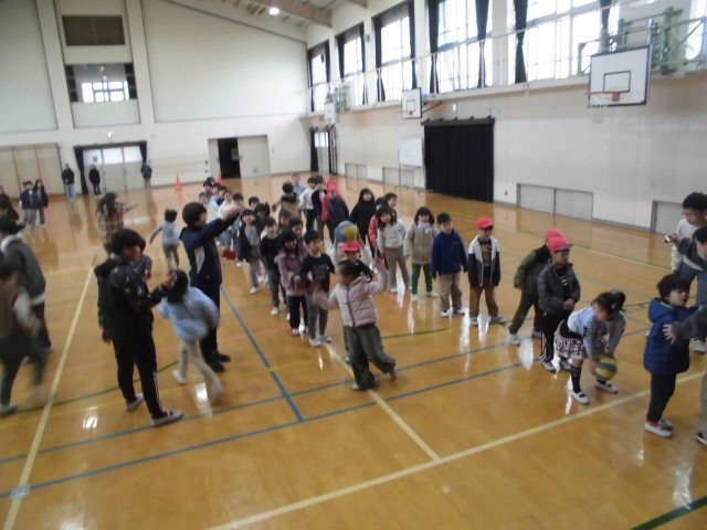 1年生は、「上」「下」と声をかけながらボールを回していくことができました。