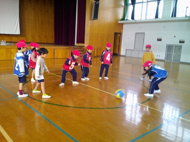 初めてのゲームでは、円の形のコートでやりました。いろいろな方向からボールがくるので、ボールをよく見てよけないと当たってしまいます。外野の人もボールがきたらすぐに転がすよう心がけていました。次もコートの形をかえて取り組んでいきます。