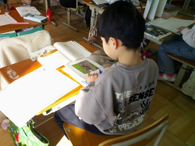 今まで学習したライオン・しまうま・カンガルー以外のほかの動物の赤ちゃんについて、本で調べてまとめていきました。今まで学習したことをいかして、赤ちゃんの様子をまとめる項目について良く分かっていて、本から必要なことを選んで書いていきました。「あざらしの赤ちゃん、かわいすぎる。」「パンダは、お母さんの手のひらくらいの大きさなんて、小さい。」「いるかには、耳はあるんかな。」と考えながら読んで、まとめようとしていました。