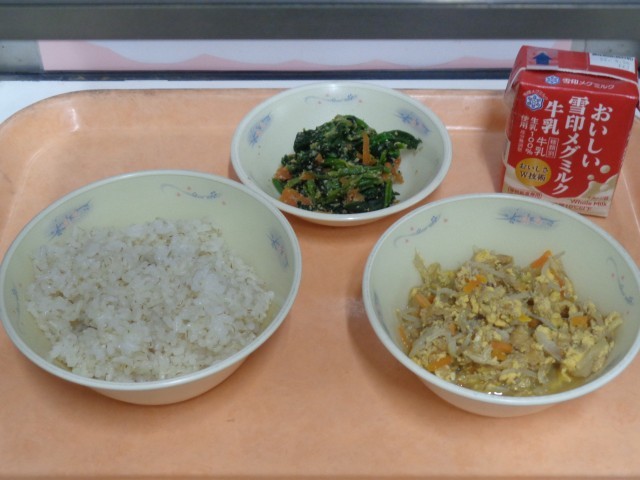 今日の給食は、麦ごはん、油あげのチャンプル、ほうれん草のごま煮、牛乳でした。油あげでおなかがふくれるの?と思ってしまいそうになりますが、おだしがじゅわっとしみた油あげと、卵、にんじんやもやしなどの野菜でボリュームたっぷりでした。ほうれん草のごま煮もかつお節とごまの風味が効いていてとても美味しかったです。ごちそうさまでした。