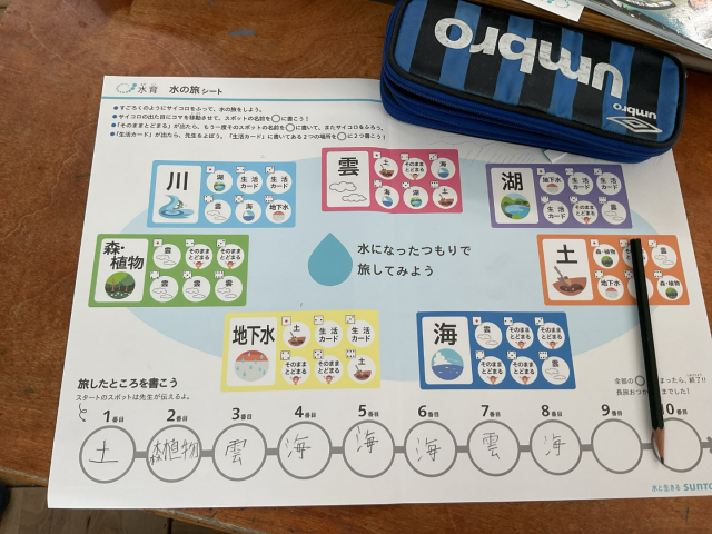 社会科「わたしたちの生活と森林」の学習では、日本にある森林に着目して、自然は無限にあるわけではないことや自然とわたしたちがどのように関わっているのかについて学習しています。そこで、SUNTORYの方にゲストティーチャーに来てもらい、水の大切さを学びました。「水育」として水のすばらしさを感じ、水を育む森の大切さに気付く学習をしました。3日には、第1時間目として水は世界中を旅しているとしてすごろくを使って「循環」を学びました。わたしたちは、水を川や湖からもらって生活していますが、もらうばかりではいつか水がなくなってしまうのでわたしたちが何かしなくてはいけないという考えになりました。