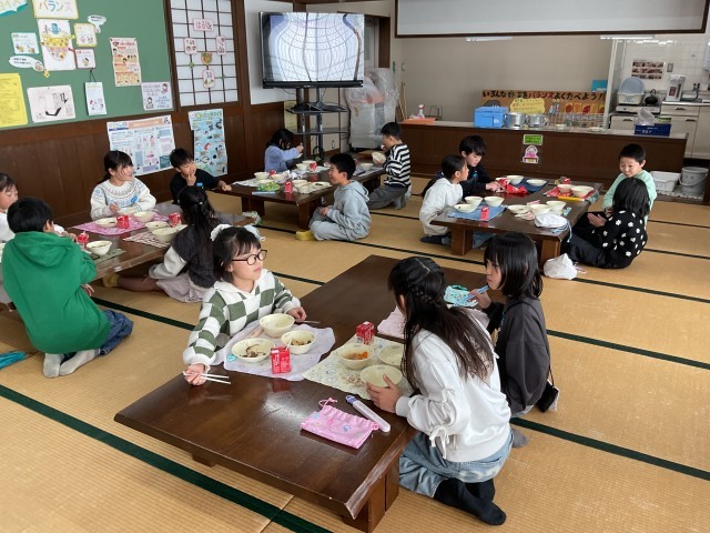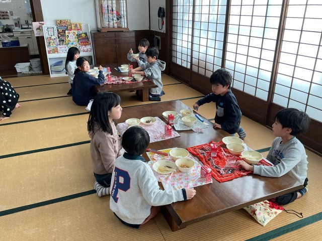 節分の行事献立だったので、「豆は数えでの歳の数だけ食べるんだよ。」「今日の夜は巻き寿司を食べるよ。」と節分の話題に花を咲かせながら食べていました。