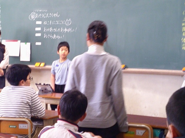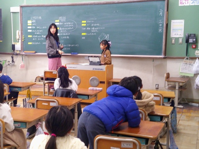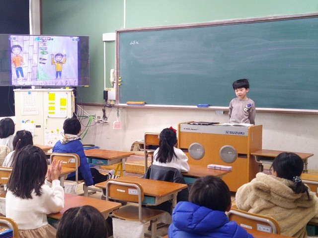 1時間目に各学年の教室に行って、冬休みに取り組んだ「にこにこ大さくせん」について発表しました。がんばったことや気づいたこと、家族や自分の気持ちを話したり、これからの生活でいかしていきたいことを伝えることができました。どの教室でも真剣に聞いてくれて、感想を言ってくれたり、自分の体験を語ってくれたりしました。まだまだ上手に受け答えをすることはできなかったですが、違うクラスに入り、大勢の前で堂々と話したことは、とてもよい経験になったと思います。終わった子どもたちの満足そうな笑顔が、また素敵でした。