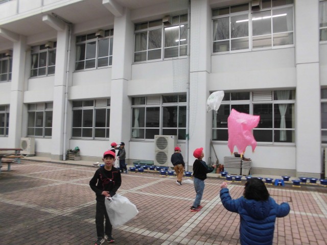 生活科の時間に、袋と洗濯バサミをつかって落下傘を作りました。とても簡単に作ることができ、たくさん遊ぶことができました。「風が吹いている時を狙って投げるといいよ!」「斜め上に投げるとふわふわ飛んで行ったよ!」と自分たちでコツを見つけて遊ぶこともできていました。