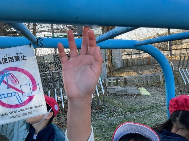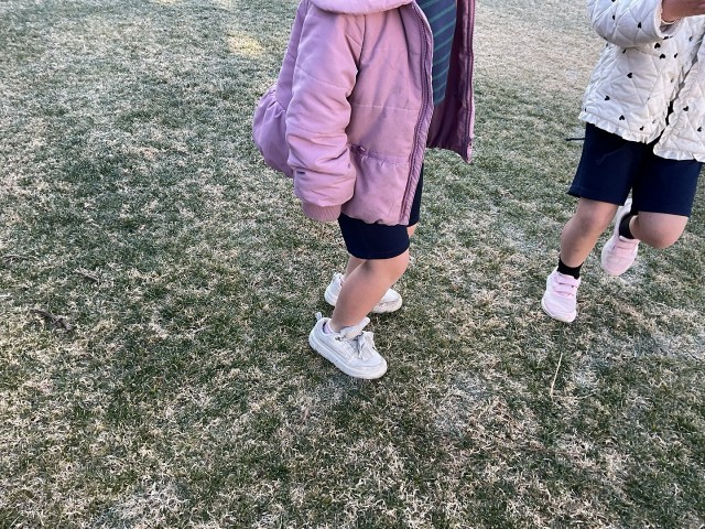 今朝の上里の気温は、マイナス1度くらいだったので、運動場や畑の様子を見に行きました。「わぁーしもがおりてる。」「芝生を歩くとしゃきしゃきして、おもしろい。」「うんていに、ミニつららができてる。」と、いろいろなことを発見して体験していた子どもたちでした。
