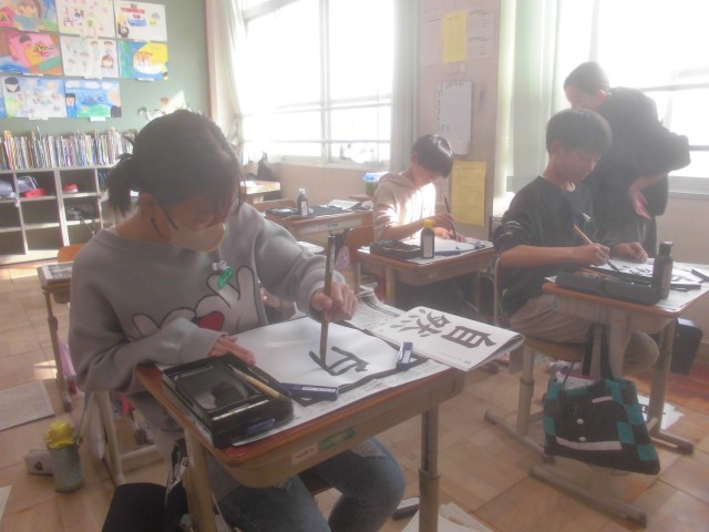毛筆学習で「自然」を書きました。2つの漢字の大きさの違いに気をつけて書きました。