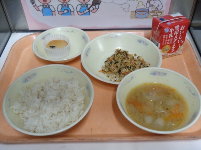 今日の給食は、「麦ごはん・とりとすぐきのまぜご飯(具)・豚汁・みやこ焼き(黒豆)・牛乳」でした。まぜご飯の具になるとすぐきの酸味がやわらぎ、そのまま漬物として食べるより子たちにとっては食べやすいようでした。みやこ焼きは新献立でしたが、米粉を使っているのでもちもちした食感でとても美味しかったです。子どもたちにも大好評で「また食べたい!」という声が聞こえていました。ごちそうさまでした。
