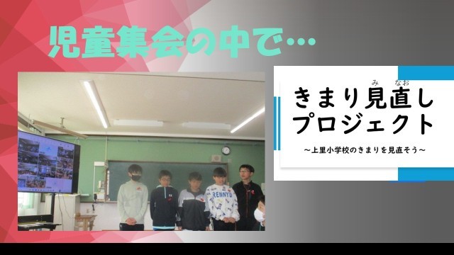 本日行われた児童集会では、「学校のきまり 見直しプロジェクト 〜上里小のきまりを見直そう〜」について、6年生による検証報告が行われました。6年生は、自分たちだけの意見で終わらせず、教職員にも聞き取りを行い、多面的に考えながらまとめようとする姿勢を見せてくれました。その姿はとても頼もしく、上里小のリーダーとして大きく成長していることを感じました。