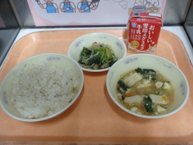 今日の給食は、「麦ごはん・鶏肉ととうふのくず煮・ほうれん草と切り干し大根のごま煮・牛乳」でした。今日は、くもりで風もあり少し寒い日でしたが、くず煮のとろみでほっこり温まりました。たっぷりのほうれん草と切り干し大根もあり栄養満点の給食で、体調を整えて元気に過ごしてほしいと思います。ごちそうさまでした。