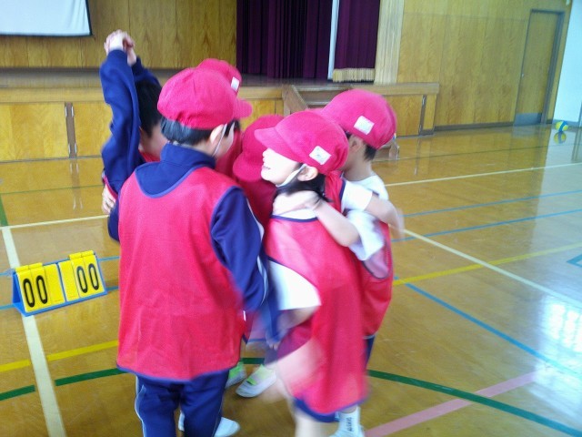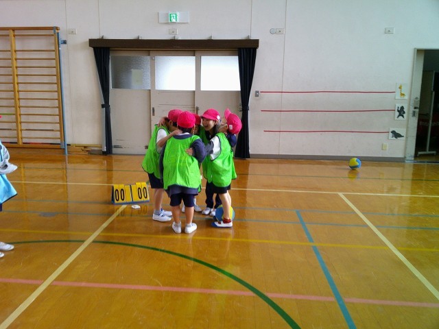 今日は、最後のころがしドッジボールでした。今まででうまくいったことを確認して、チームごとに作戦を決めていどみました。「いろいろなところから、転がそう。」「移動して転がそう。」「きたらすぐに転がそう。」など、チームで話し合ったことを円陣を組んでコールして取り組みました。今までで一番、ボールのスピードも速く、返すのもはやくて、ハラハラドキドキするゲームとなりました。