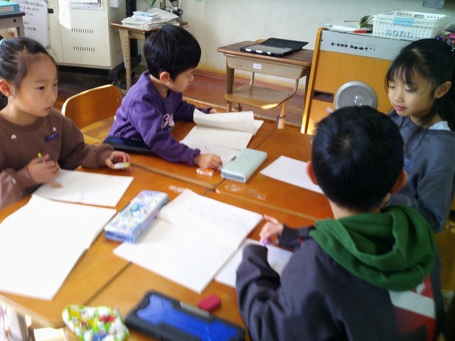 国語の学習で、ことばあそびをつくりました。グループで相談しながら、どんなクイズにするかを考え、一人ずつカードに書きました。