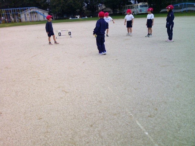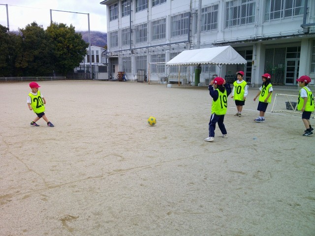 今日からボールけりゲームの学習が始まりました。最初にチームで、パスの練習をしました。ボールを止めて、友だちにむけてインサイドキックをする練習をしました。