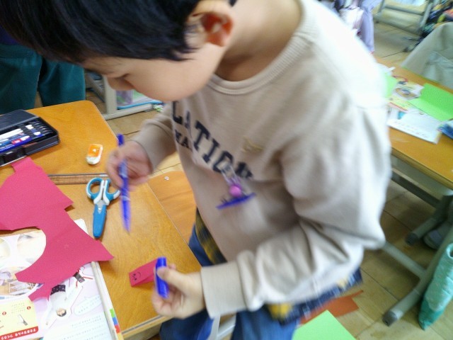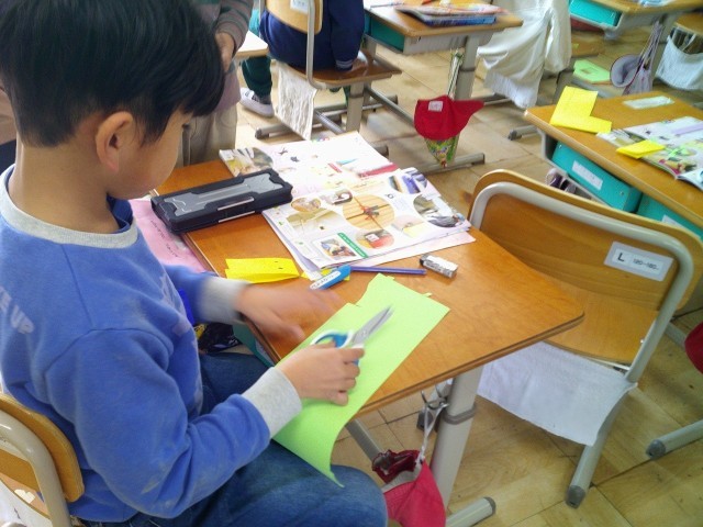 図工の学習で、今日はすきまちゃんを色画用紙を使って作りました。顔の表情や手足を工夫していて、それぞれかわいらしいすきまちゃんができました。