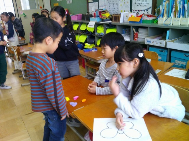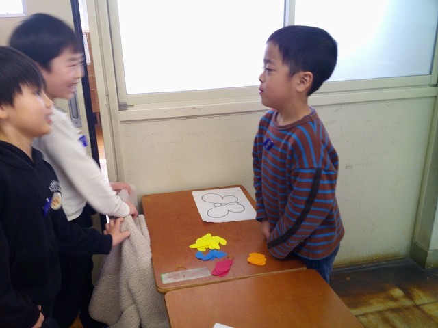 じぶんだけのちょうちょを作るために、ほしい色の模様を伝える活動をしました。お店屋さんの役とお客さんの役になって、好きな色の模様を集めていきました。「One? Two?」など、いくつほしいかも伝えたり、「Big.Please!」とほしい大きさも伝えたりして、自分だけのちょうちょになるように集めていました。どんなちょうちょになるのか、楽しみです。