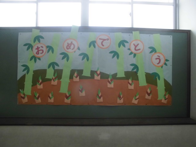 先週、子ども達が作った竹、笹の葉、たけのこを貼って、「おめでとう」の掲示が出来上がりました。