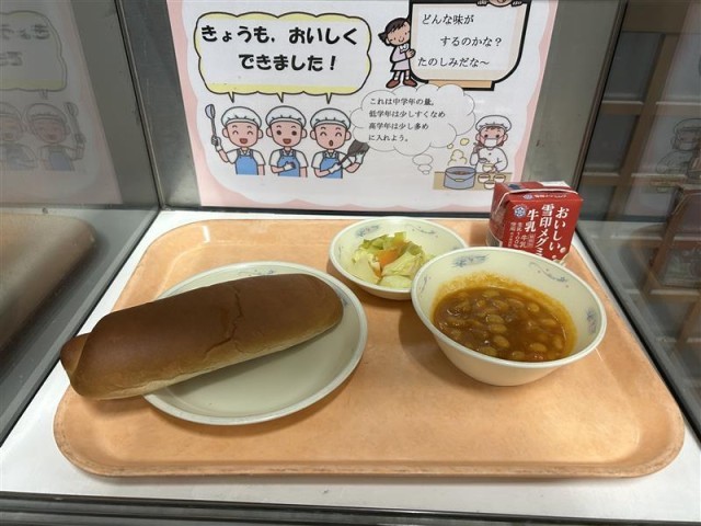 今日の給食は、「黒糖コッペパン・牛乳・ポークビーンズ・野菜のホットマリネ」です。