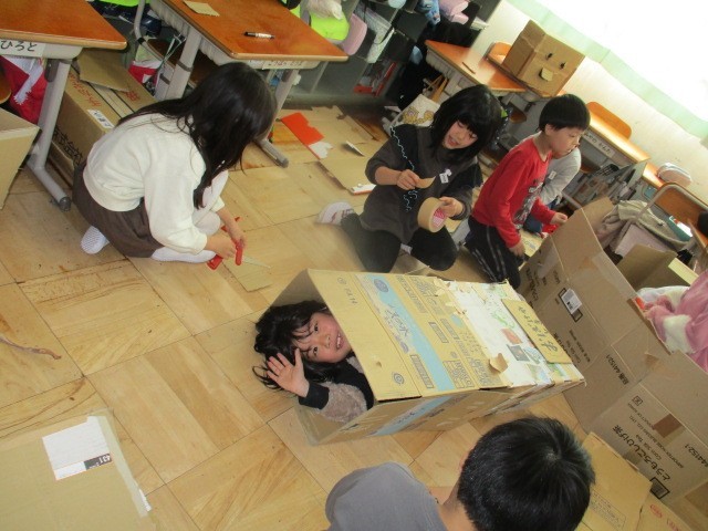 図工「だんボールに入ってみると」