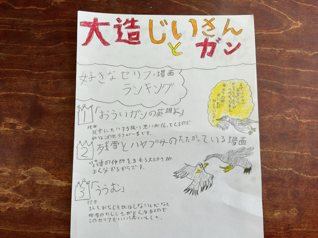 国語科大造じいさんとガンでは、物語のみりょくを伝える成果物を作りました。みんなでどの場面が一番心に残ったのか、どのセリフが心に残ったのか等話し合いを通して自分が伝えたい「みりょく」を考えています。本の帯やポスターでまとめている子がいました。