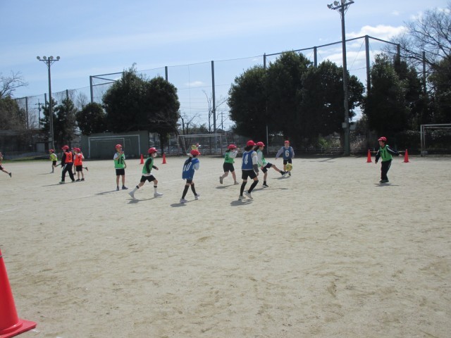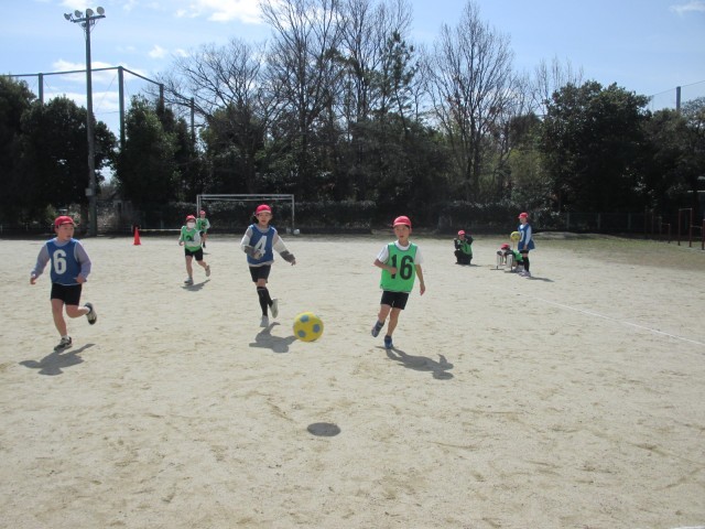 4年生では、交流体育でサッカーをしています。広いサッカーコートを一生懸命に走りながらボールを追いかける姿が素敵です。